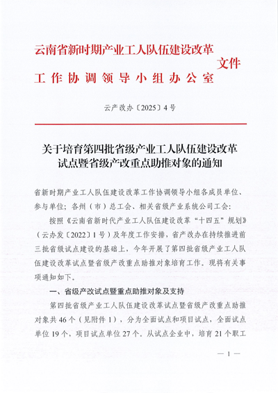 按照《云南省新時(shí)代產(chǎn)業(yè)工人隊(duì)伍建設(shè)改革“十四五”規(guī)劃》(云辦發(fā)[2022]1號(hào))及年度工作安排,云南省產(chǎn)改辦在持續(xù)推進(jìn)前三批省級(jí)試點(diǎn)建設(shè)的基礎(chǔ)上,于今年開展了第四批省級(jí)產(chǎn)業(yè)工人隊(duì)伍建設(shè)改革試點(diǎn)暨省級(jí)產(chǎn)改重點(diǎn)助推對(duì)象培育工作。